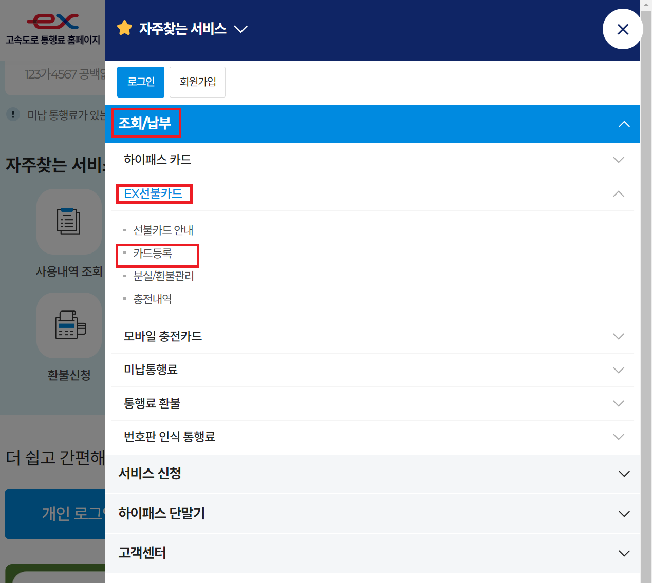 선불 하이패스 카 드 등록은 고속도로 통행료 홈페이지 접속하셔서 조회/납부 메뉴>EX선불카 드>카 드등록 클릭하여 등록하면 됩니다.