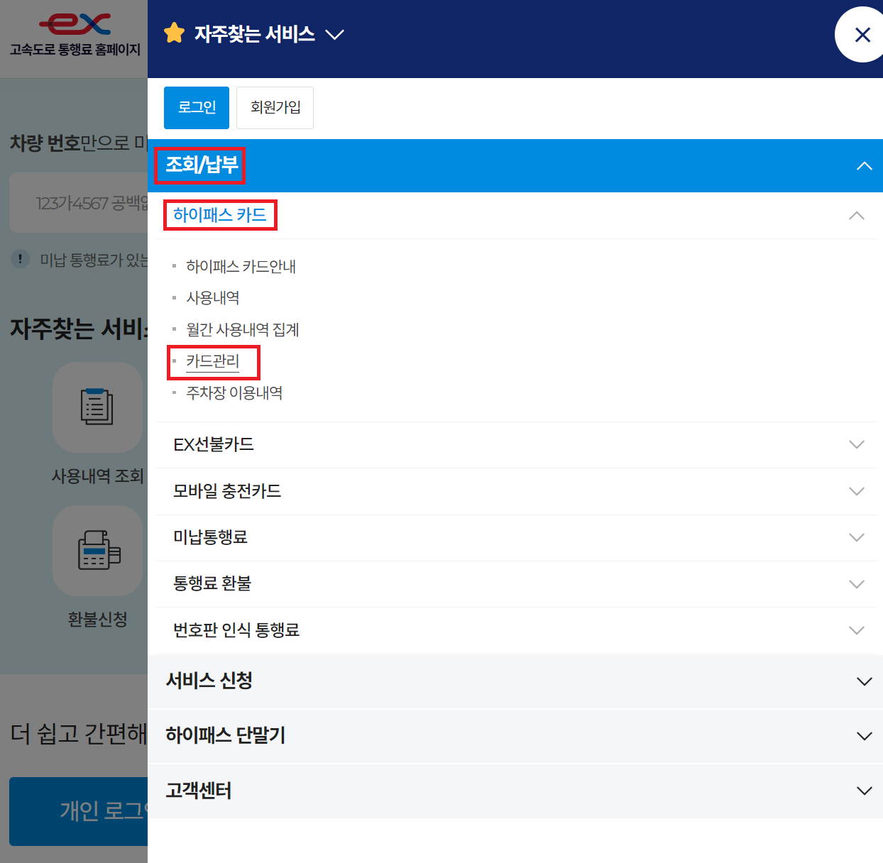 하이패스카 드는 온라인에서 구매가 가능하지만 배송비가 별도로 발생되므로 고속도로 휴게소 종합안내소, 영업소, 하이패스센터에서 5,000원에 카 드를 구입할 수 있습니다. 카 드를 구입한 후에 하이패스홈페이지에서 회원가입후 로그인합니다. 카 드번호 입력 후 EX선불카 드를 등록합니다.