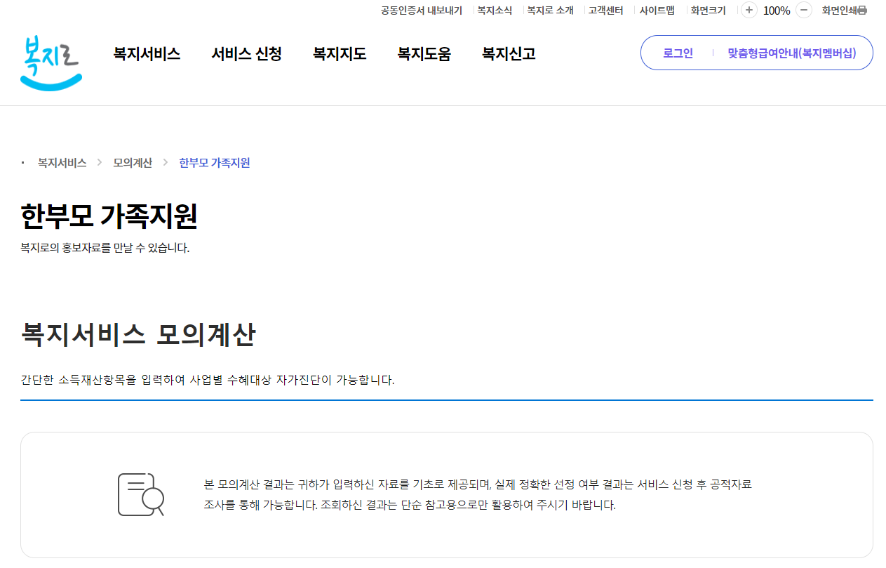 아래 홈페이지에서는 한부모 가족 복지 지원을 받을 수 있도록 모의계산을 할 수 있습니다.