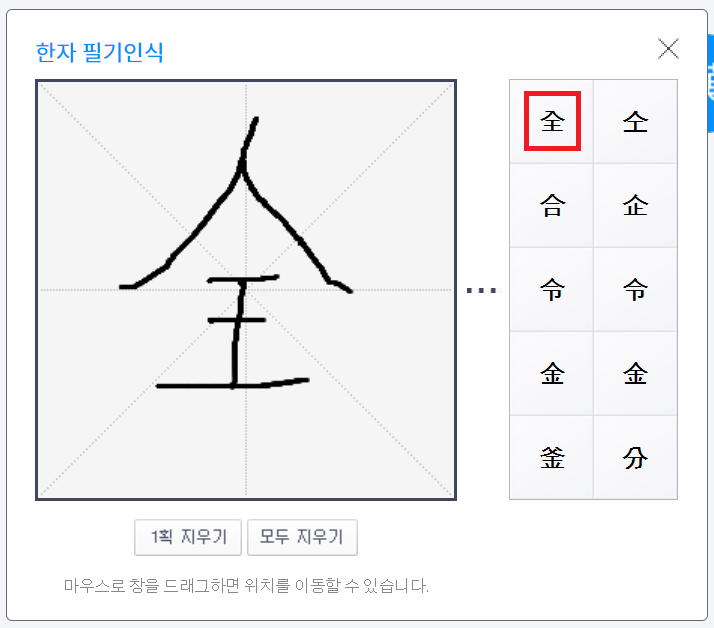온전할 전(全) 한자를 쓰기 위해 위에서부터 작성하면 그와 비슷한 한문들이 오른쪽에 표됩니다. 잘못적었을 때는 하단에 1획 지우기 버튼을 클릭합니다.
