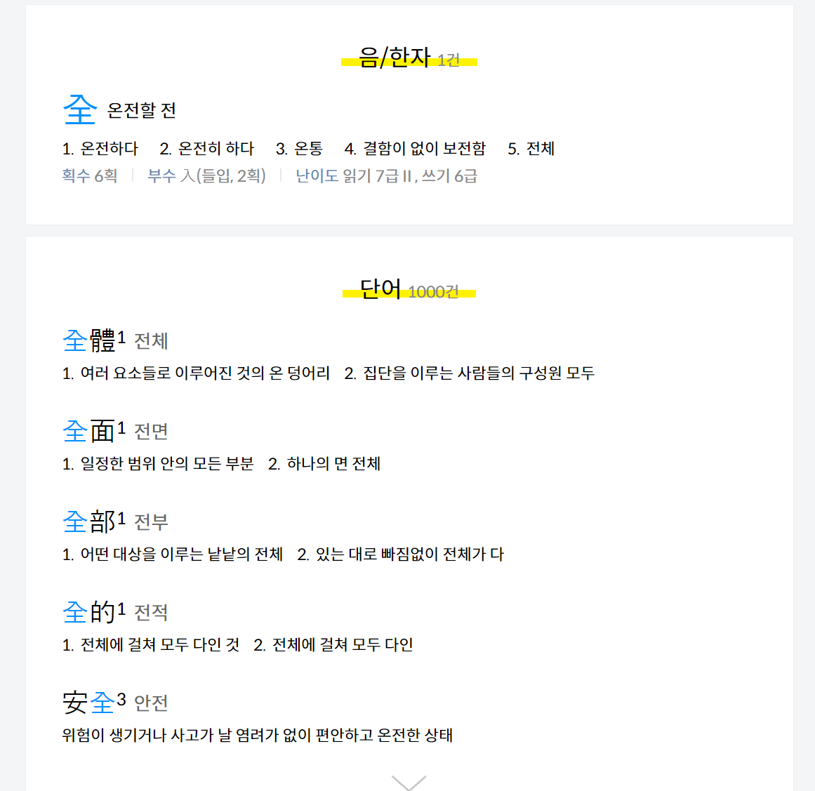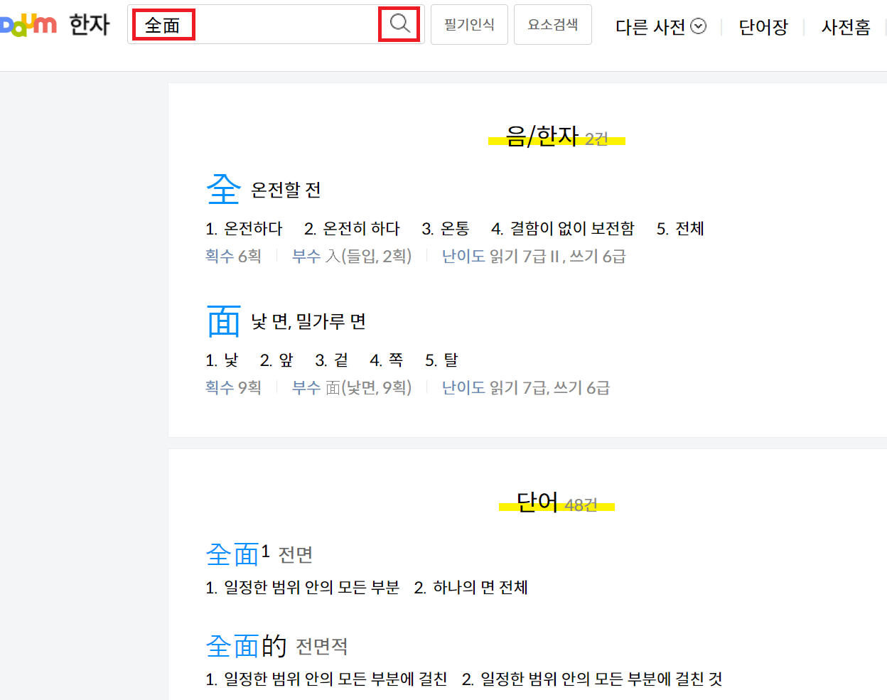 위 화면과 같이 한자를 검색하면 아래와 같이 내용이 나옵니다.