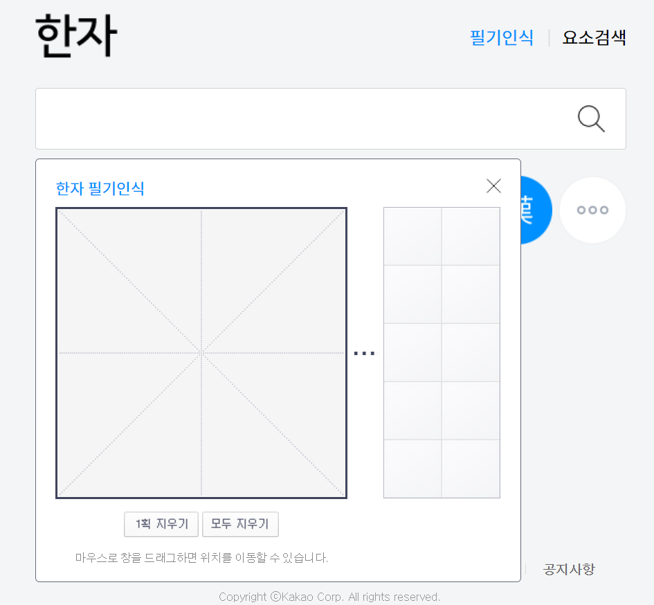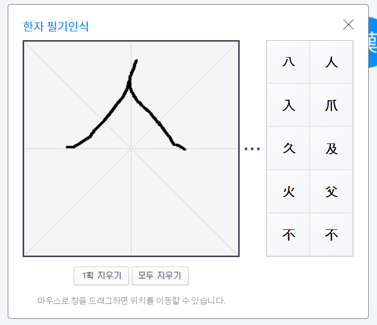연필로 글씨를 쓰듯이 마우스로 모르는 한자를 비슷하게 씁니다.