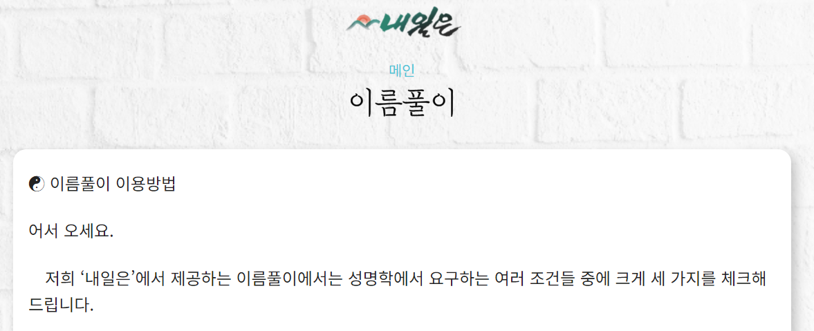 '내일은' 사이트에서 제공하는 한자 이름 풀이 사이트에서 무료로 이름 풀이가 가능합니다. 이름풀이 외에도 일정 비용을 지불하면 작명을 하거나 사주, 운세 등을 확인해 볼 수 있습니다.