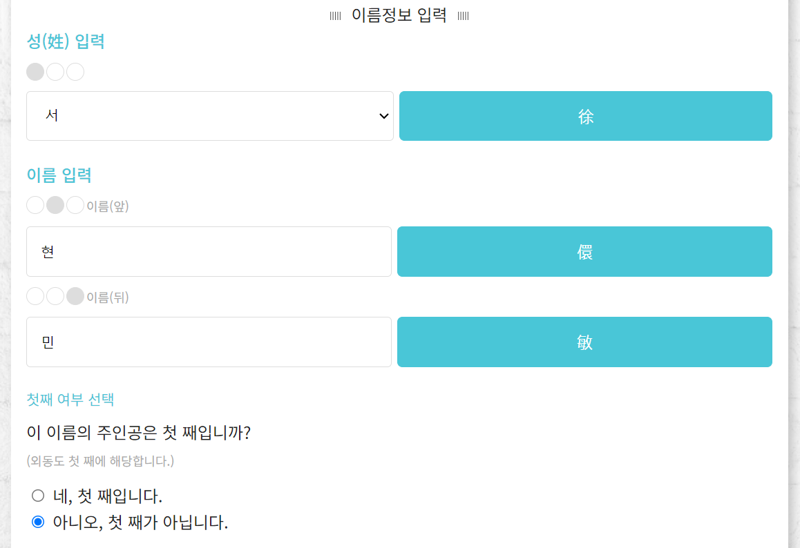 이름정보를 입력하고 첫째여부를 묻는 질문에 답변 버튼을 선택 후 '무료결과 보기'를 클릭합니다.