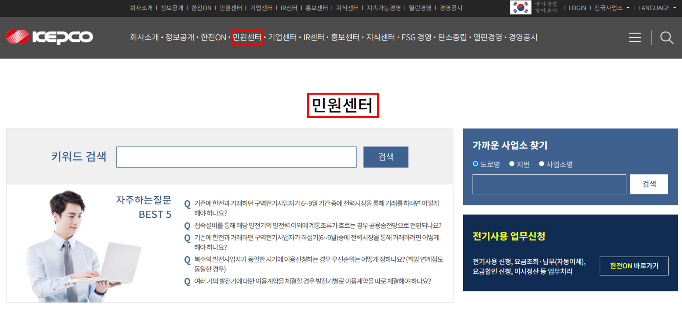 PC 또는 모바일앱을 통해 한국전력공사 홈페이지에서 문의할 수 있습니다. 상단의 민원센터 메뉴로 접속한 후에 이용할 수 있습니다.
