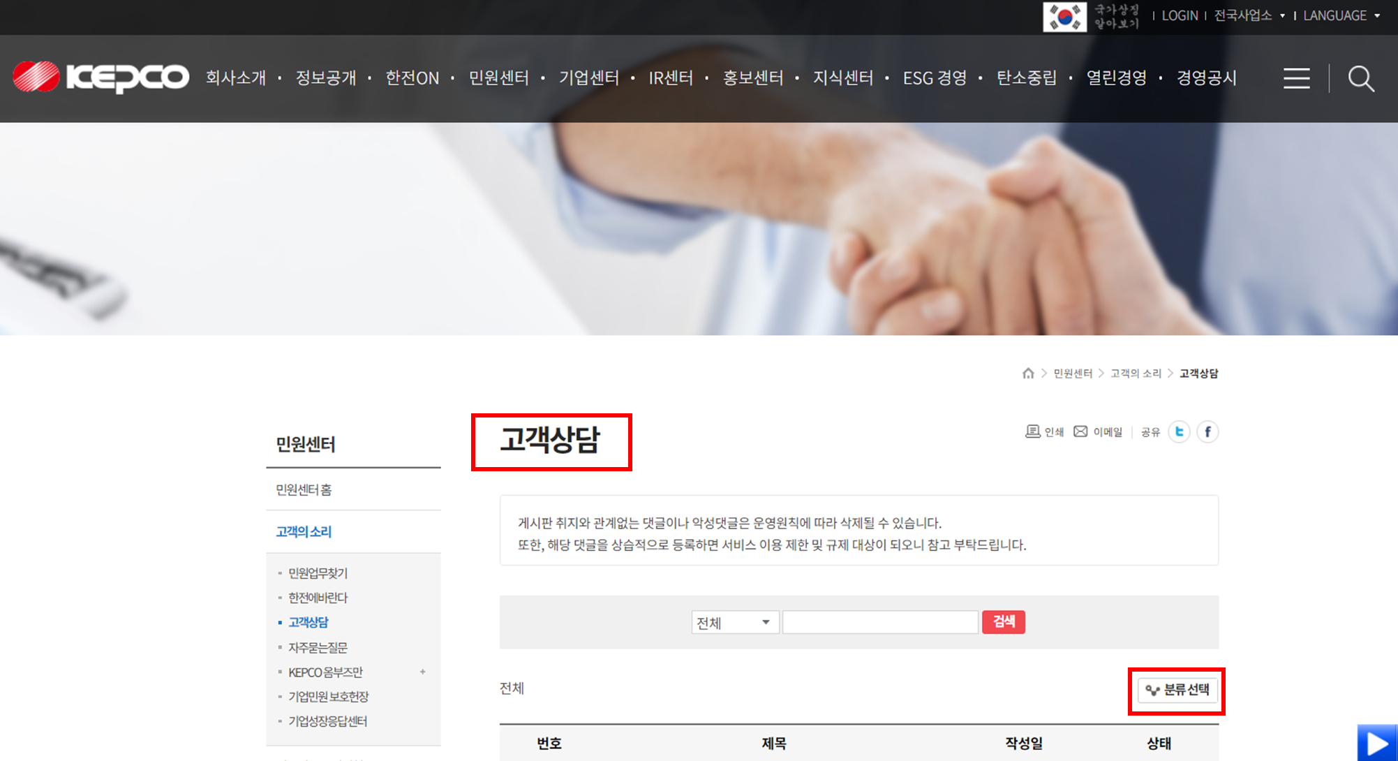 분류 선택을 누르면 전기사용(신청, 변경, 구비서류 등), 전기요금(사용량, 납부, 할인, TV수신료 등) 등을 상담할 수 있는 창이 뜹니다. 회원가입을 하고 이용이 가능합니다.