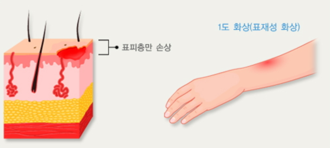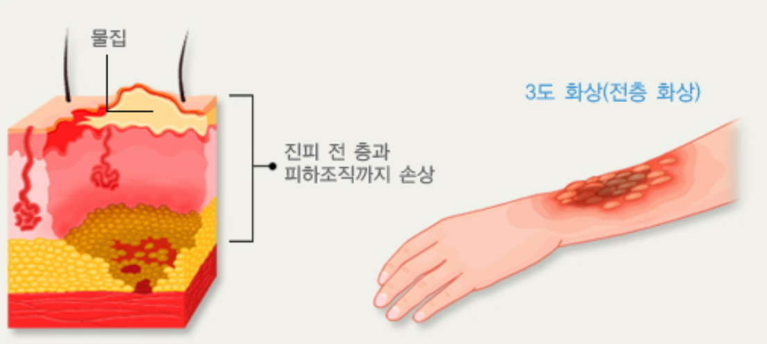 표피층만 손상되면 1도 화상, 표피층과 진피층까지 손상되면 2도 화상, 표피, 진피의 전층과 피하 지방층까지 손상되면 3도 화상으로 구분합니다.
