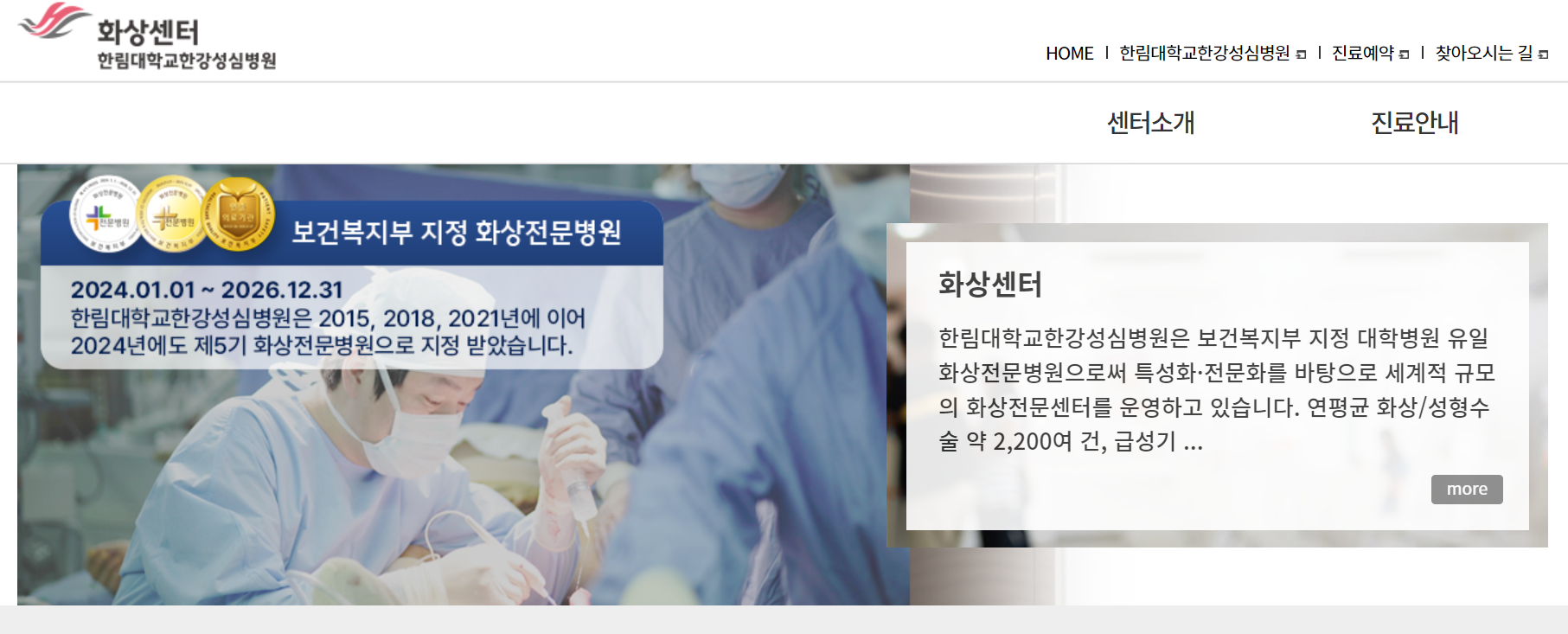 한림대학교한강성심병원은 보건복지부 지정 화상 전문 대학병원으로 화상외과, 성형외과, 재활의학과 등 여러과 전문의가 전담팀을 꾸려 국내 최대 규모의 화상센터를 운영하고 있습니다.