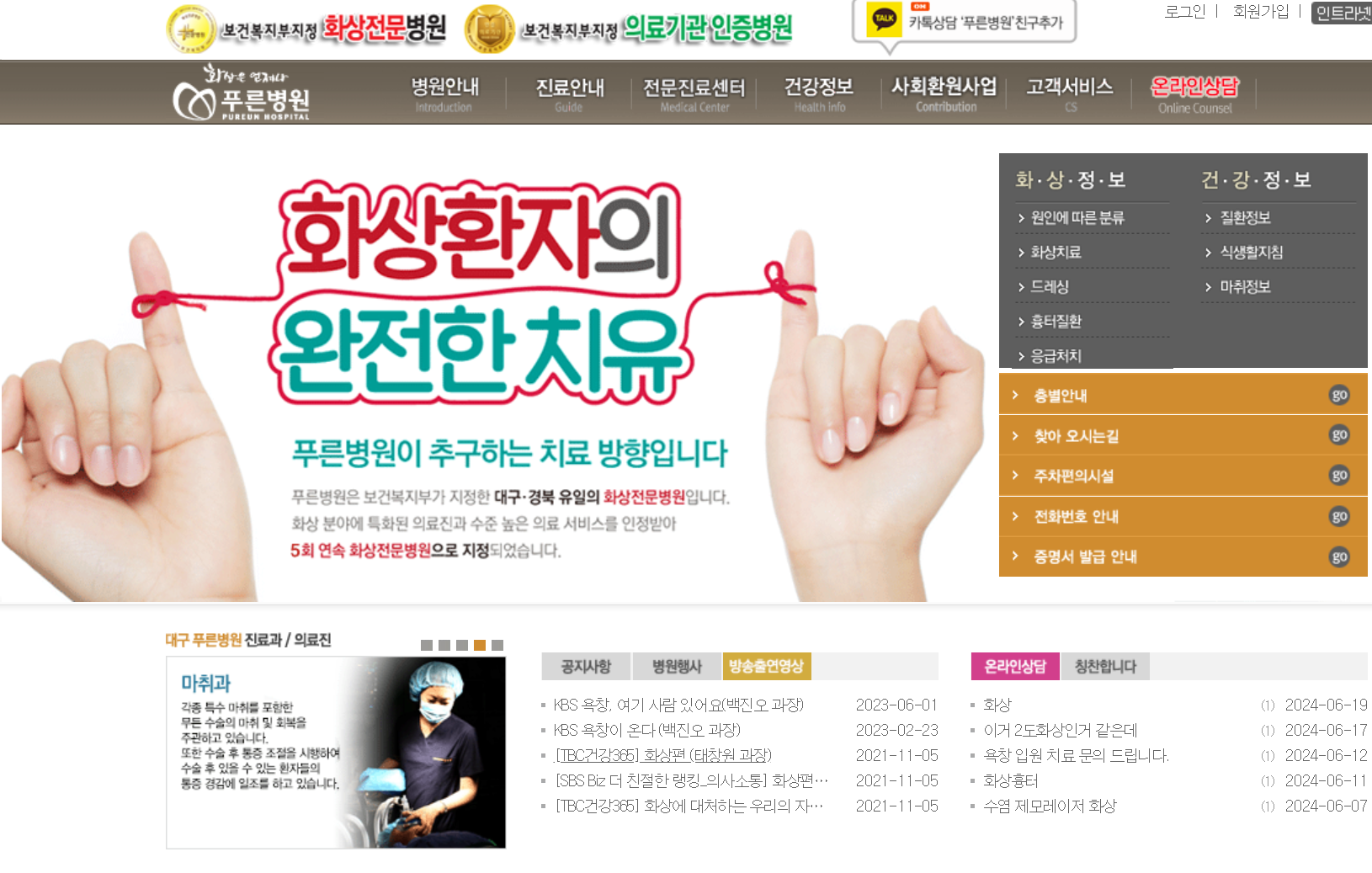 대구, 경북 유일 보건복지부 지정 화상전문병원으로 24시간 응급실을 운영하며 화상분야에 특화된 의료진과 서비스를 받을 수 있습니다.