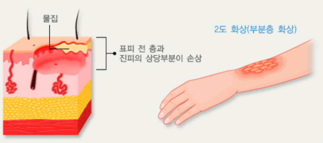 여기서 2도 화상은 진피층의 일부만 손상된 얕은 형과 진피층의 대부분이 손상된 깊은 형으로 나뉩니다.