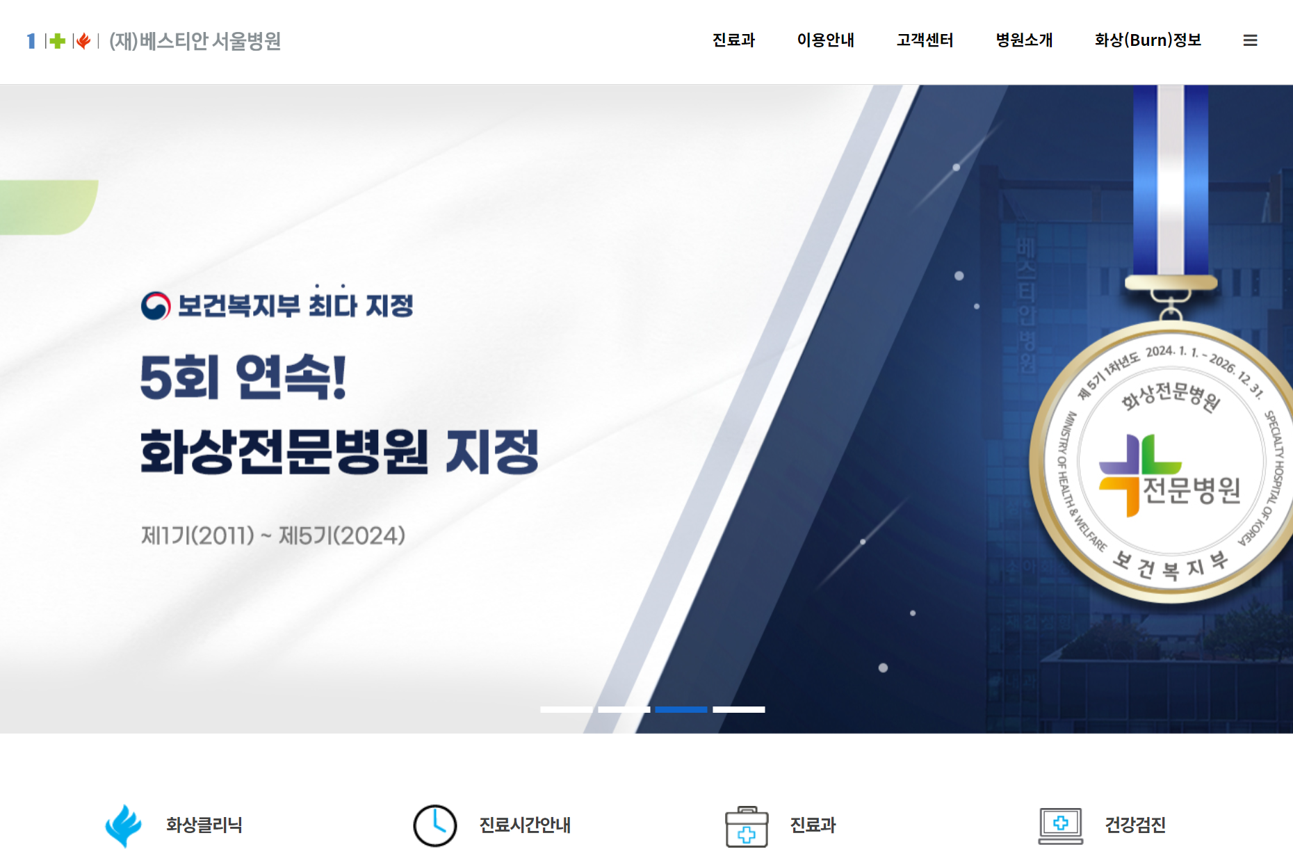 전국에 보건복지부가 지정한 전국 화상전문병원은 총 5군데 입니다. 서울에는 2곳, 부산 1곳, 충북 청주 1곳, 대구 1곳입니다.