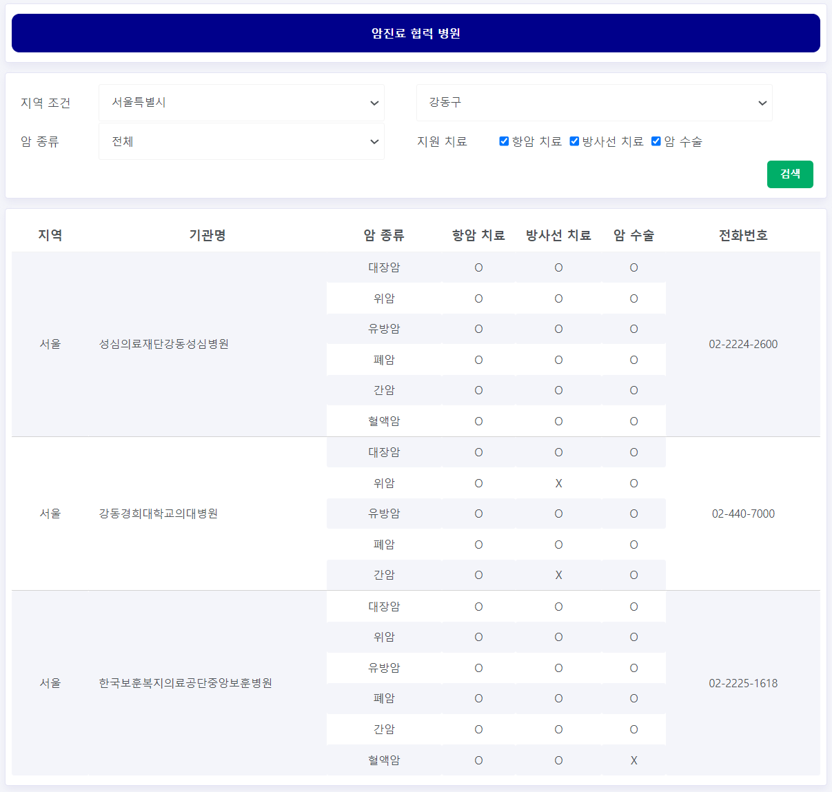 오른쪽 상단에 '암진료 병원 안내' 버튼을 누르면 '암진료 협력 병원' 검색 페이지로 이동됩니다. 지역을 선택후 검색하면 암진료를 보는 병원명과 연락처를 한눈에 볼 수 있어서 편리합니다.