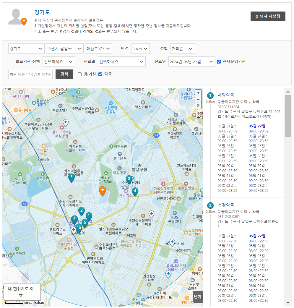 주소를 누르고 반경 3km 병의원을 체크한 후에 검색을 누르면 병원의 현황을 알 수 있습니다. 약국을 체크한 후에 검색을 눌렀을 때는 근방의 약국 영업시간을 알 수 있습니다.