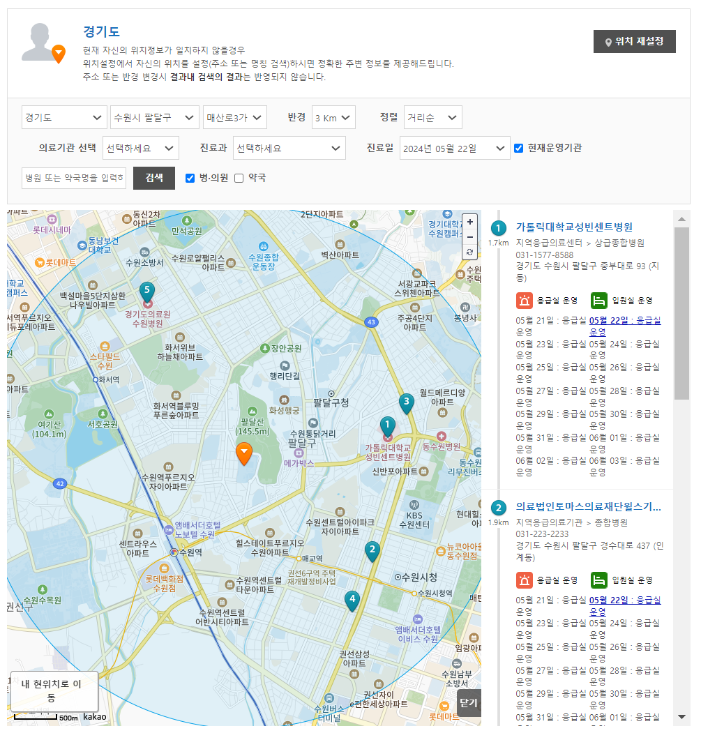 주소를 누르고 반경 3km 병의원을 체크한 후에 검색을 누르면 병원의 현황을 알 수 있습니다. 약국을 체크한 후에 검색을 눌렀을 때는 근방의 약국 영업시간을 알 수 있습니다.