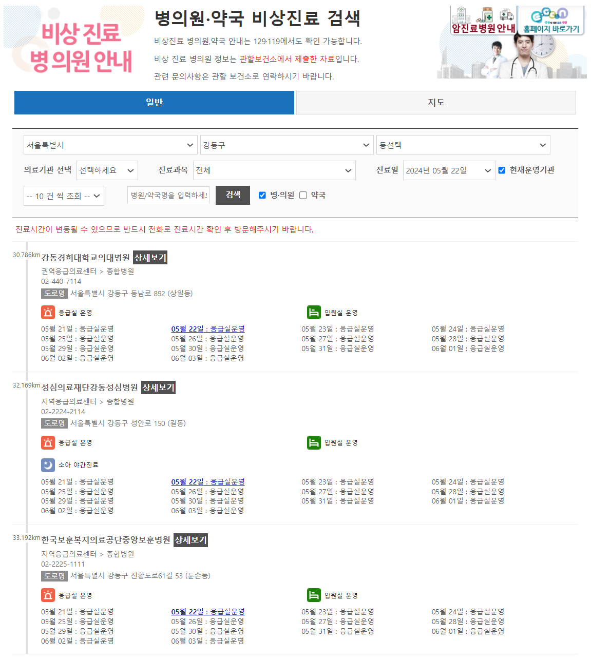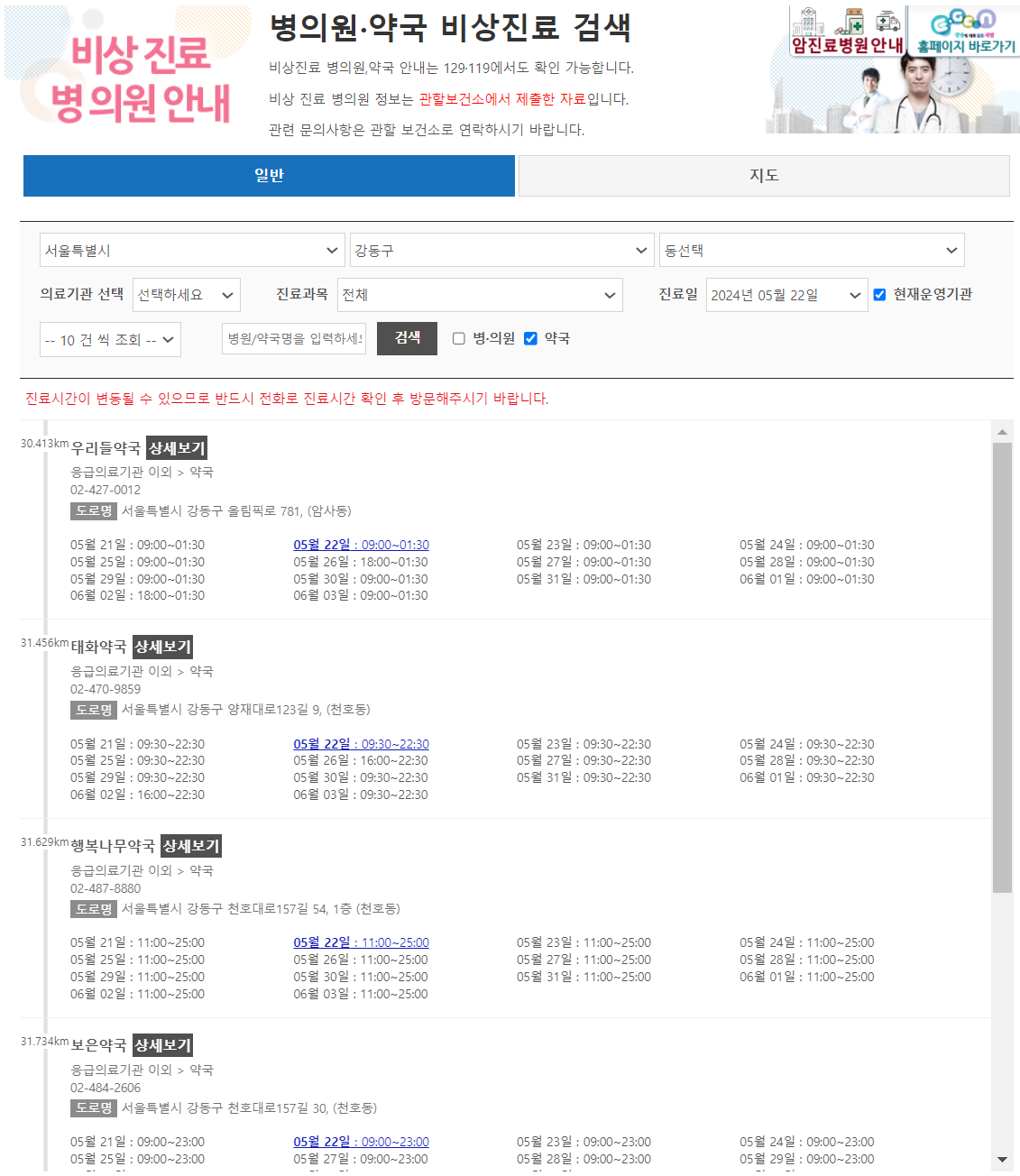 비상진료보는 병의원, 약국 찾기
