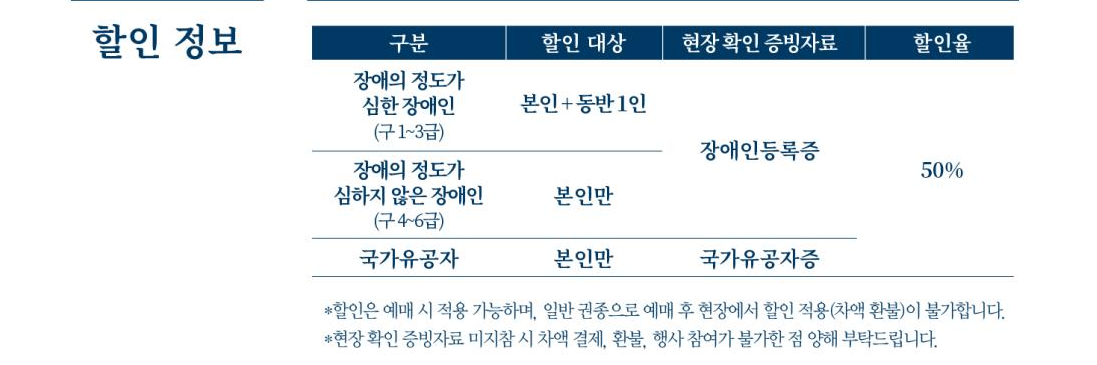 ● 할인정보 : 장애인 50%할인(중증 1~3급 본인 포함 2인) / (경증 4~6급 본인 한정), 국가유공자 본인 한정 50% 할인