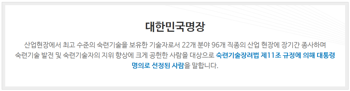 장기간 종사하여 숙련기술 발전 및 숙련기술자의 지위 향상에 크게 공헌한 사람을 대상으로 숙련기술장려법 제11조 규정에 의해 대통령 명의로 선정된 사람을 말합니다.