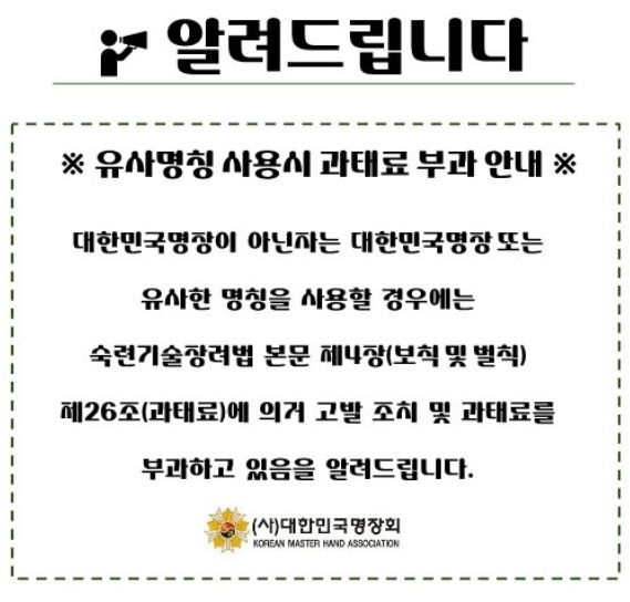 대한민국명장이란 호칭을 정확하게 알지 못하는 소비자들은 명장이 아닌 다른곳에서 잘못 알고 구매하고 있습니다. 제도 헛점으로 인해 별다른 제재 없이 비슷한 호칭을 사용하고 있습니다.