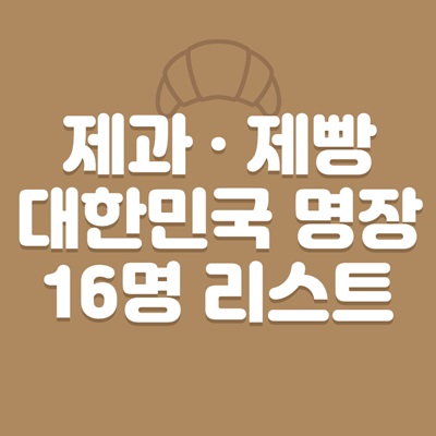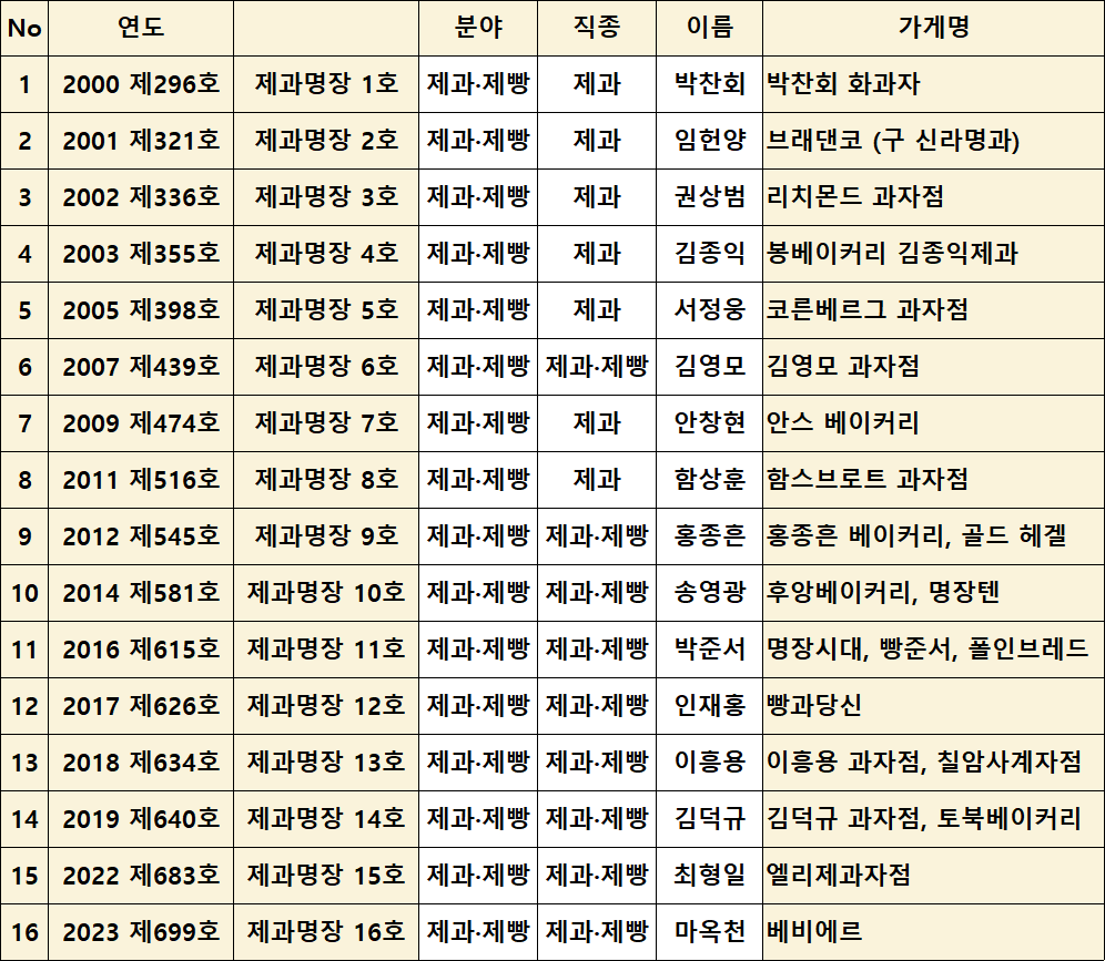 대한민국 명장에 까다로운 선정 기준과 절차를 거쳐 선정되면 대통령 명의의 증서와 휘장, 명패를 받습니다. 아래는 16명의 대한민국 제과제빵 명장 리스트입니다.
