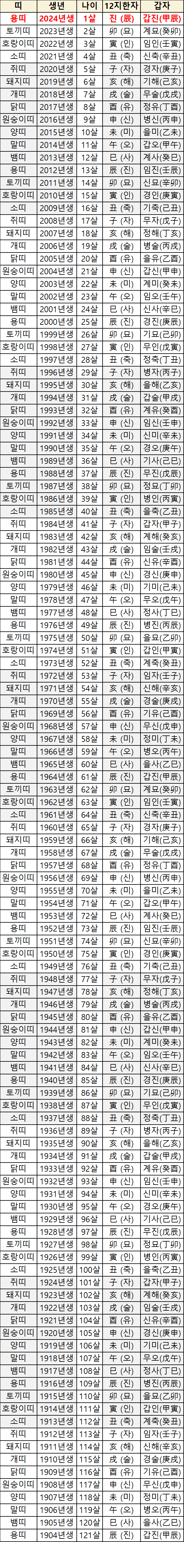 2024년 갑진년 띠별 나이 조견표는 나이를 한눈에 볼 수 있도록 만들어진 표입니다. 아래 2024년 띠별 나이 조견표를 확인해보시기 바랍니다.