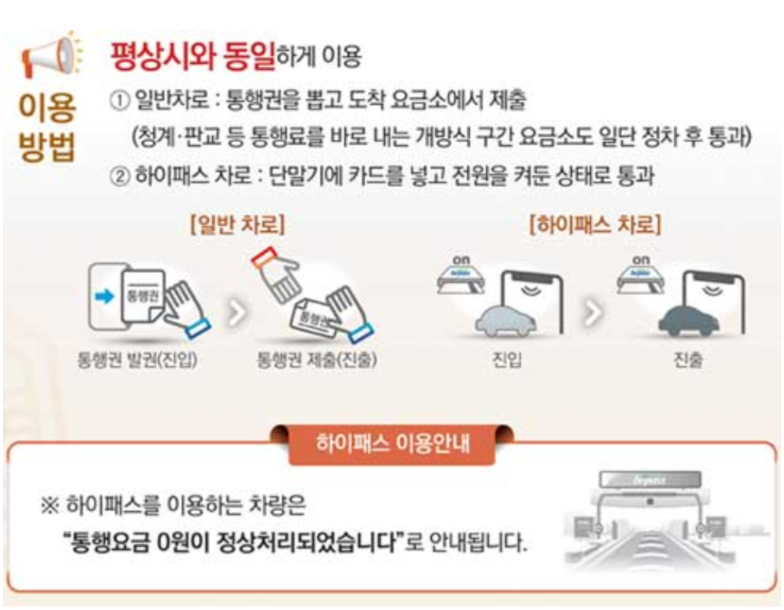 추석 고속도로 통행료 면제 이용 방법은 평상시와 동일하게 이용하는 것입니다. 하이패스 차량의 경우는 하이패스 차로 통과 시 자동으로 통행료 0원이 처리되며, 하이패스 구간을 지나가면 "통행요금 0원이 정상처리되었습니다" 로 안내됩니다.