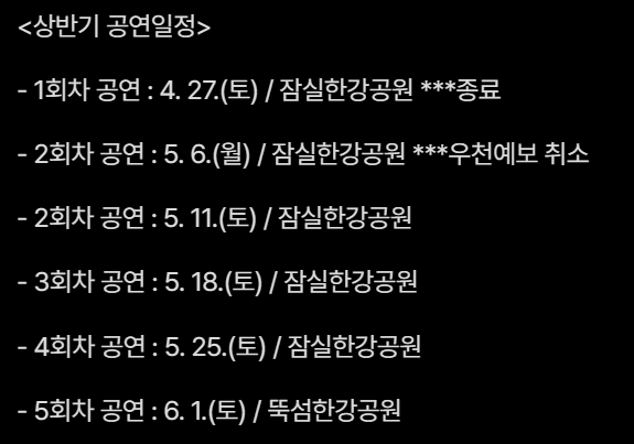 • 2회차 공연 : 5월 11일 토요일 / 잠실한강공원 예정