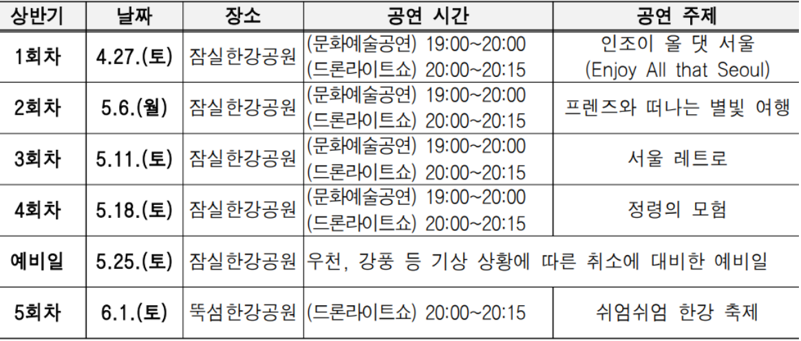 1회차~4회차는 잠실한강공원에서, 5회차 공연은 뚝섬한강공원에서 진행됩니다. 공연 운영시간은 19시부터 20시 15분까지 입니다. 문화예술 공연이 19시부터 20시까지, 드론 라이트 쇼는 20시부터 20시 15분까지 15분간 짧게 진행됩니다.