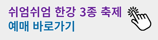 * 쉬엄쉬엄 한강 3종 축제는 패들보드 체험, 카약 체험, 한강 보물찾기, 무소음DJ파티를 비롯해 수영+자전거+달리기 등 남녀노소 누구나 즐길 수 있는 시민 체험형 축제입니다. 예매를 원하시면 아래를 클릭하여 확인하시기 바랍니다.