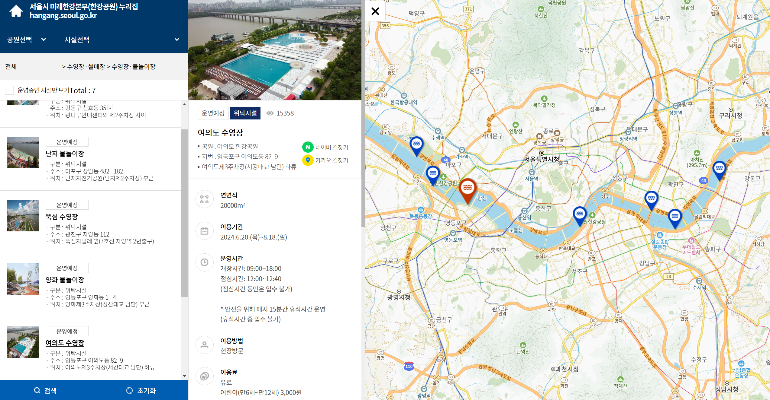 아래 버튼을 누르면 한강수영장 위치를 파악할 수 있습니다. 각 수영장별로 위치가 지도에 보여집니다.