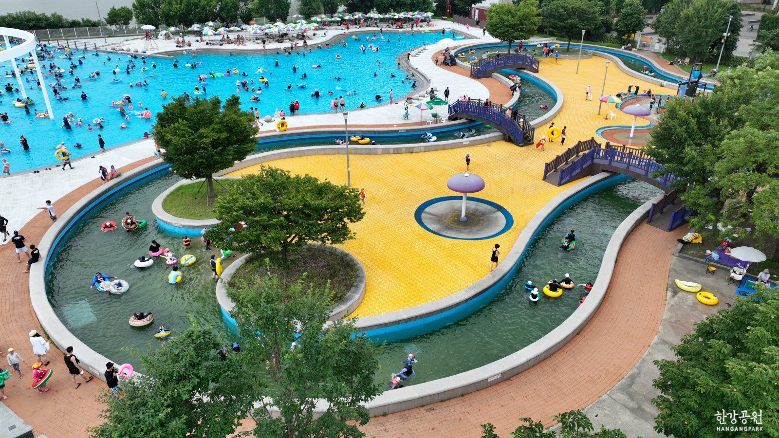 한강수영장은 수심이 깊은 편이고 다양한 놀이 시설이 많아 성인까지 이용할 수 있습니다. 물놀이장은 수심이 얕기 때문에 어린아이와 함께 방문하면 좋습니다.