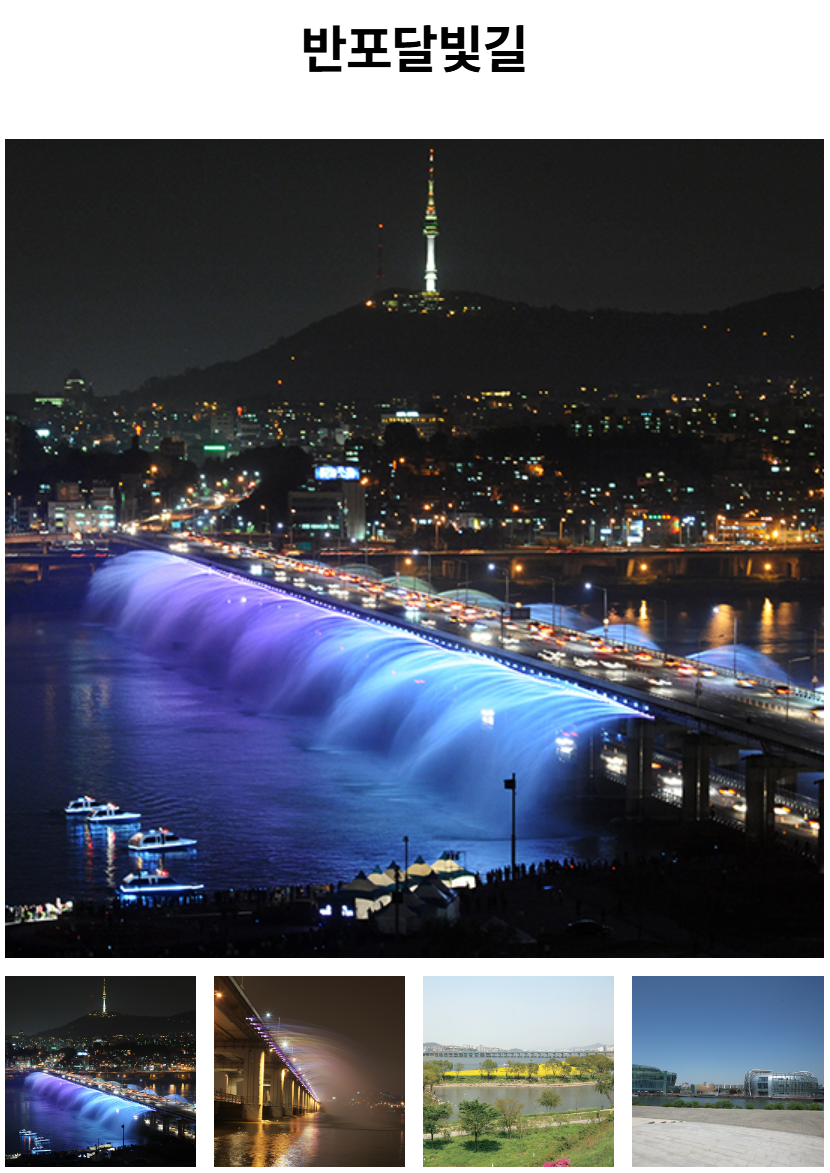 - 반포달빛길 : 서래섬, 세빛섬, 달빛무지개분수, 잠수교 등을 걷는 감성 야경투어