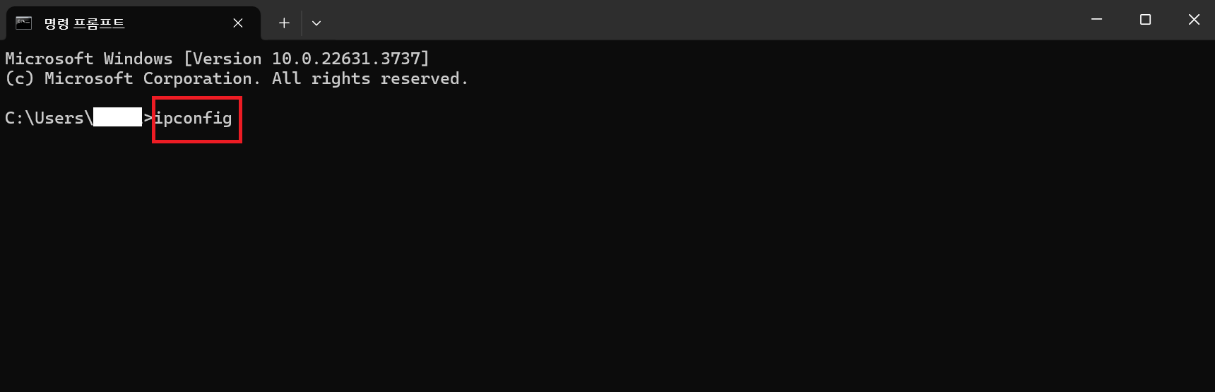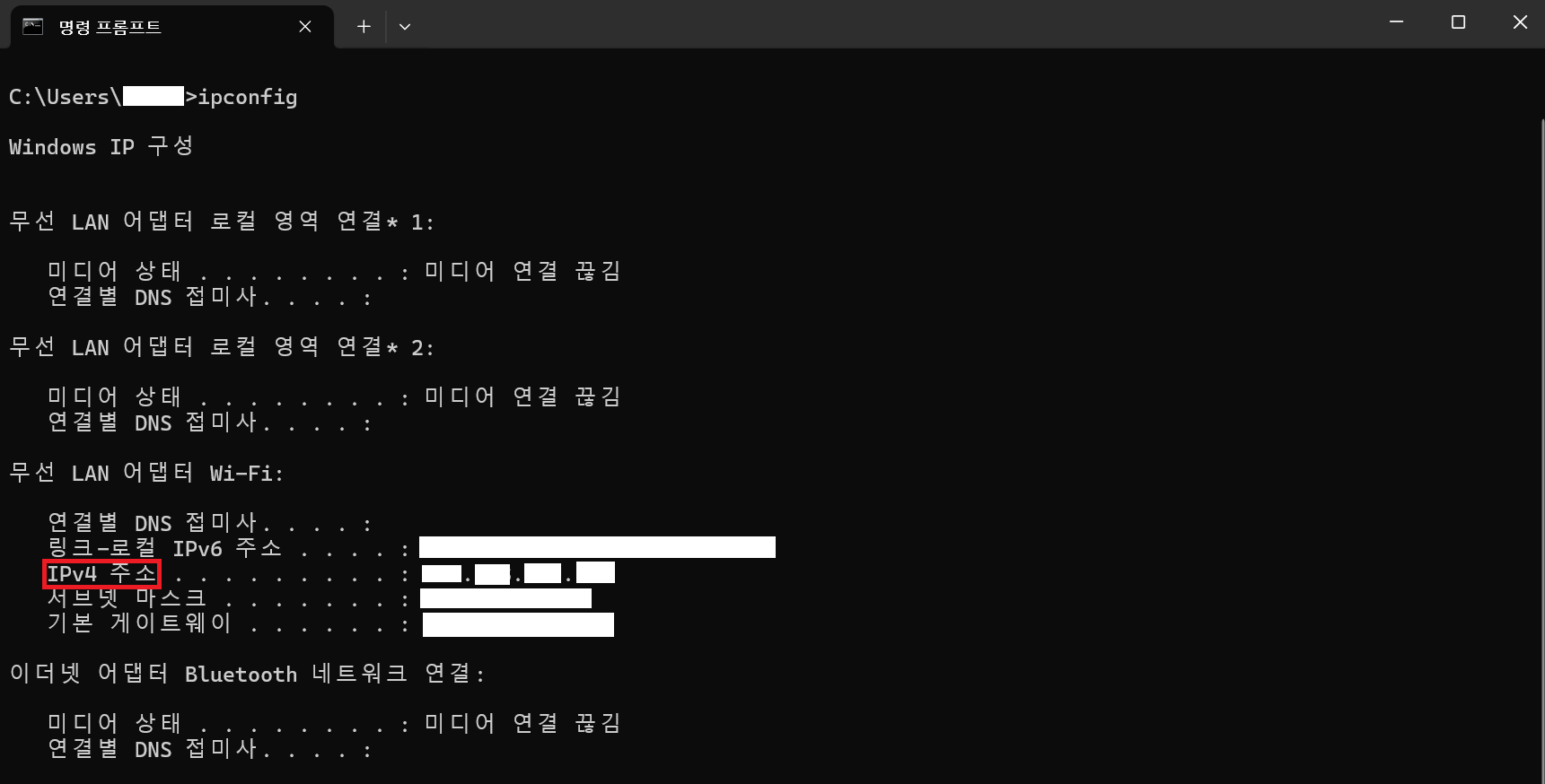 명령 프롬프트에 명령어를 <ipconfig>를 입력합니다.