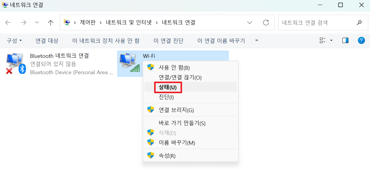 연결되어 있는 인터넷 아이콘 오른쪽 마우스 키를 누르면 상태를 클릭합니다.