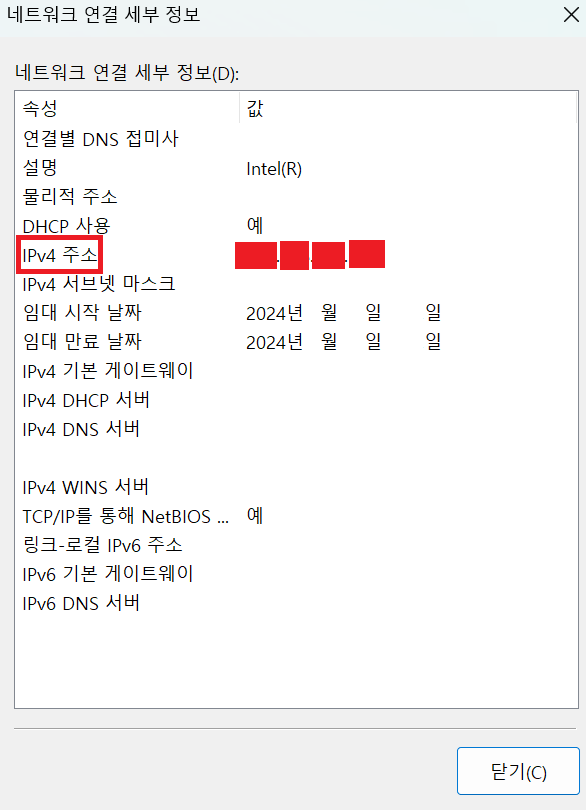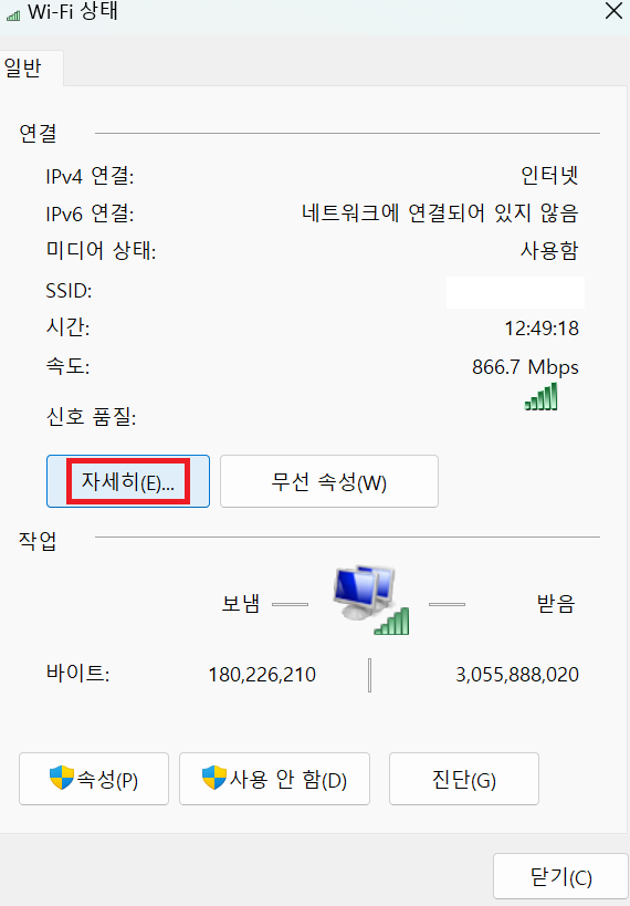 자세히 버튼을 누르면 네트워크 연결 세부 정보 안에 IPV4 주소가 나와 있습니다.