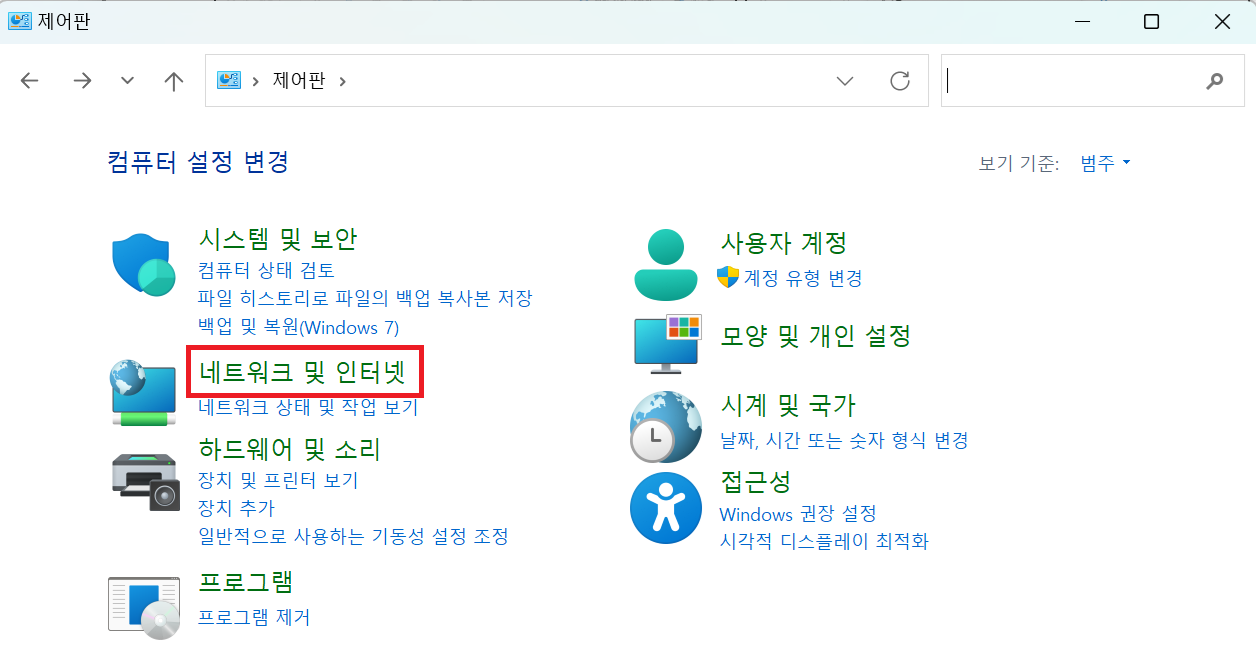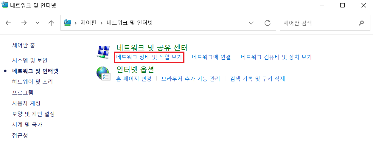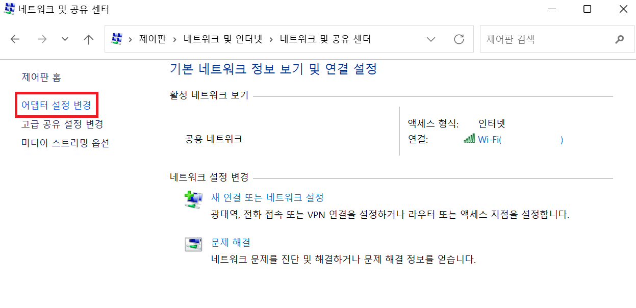 네트워크 및 인터넷 클릭 > 네트워크 상태 및 작업 보기 클릭 > 어댑터 설정 변경 클릭