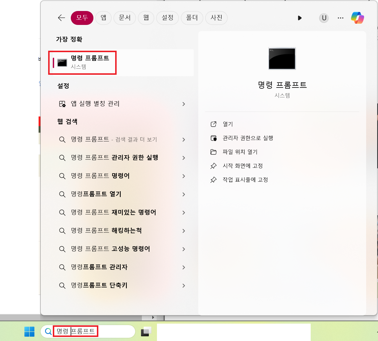 검색에 <명령 프롬프트>를 입력합니다. <명령 프롬프트>를 클릭하여 실행합니다.